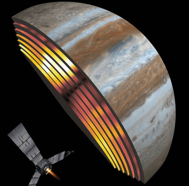 Juno è dotato di radiometri a microonde in grado di osservare la luce che emerge da centinaia di chilometri sotto le cime delle nuvole di Giove., I primi risultati scientifici, basati sul primo flyby di Giunone, suggeriscono già che la distinta fascia di Giove di zone chiare e cinture di colore scuro si estende fino a 350 km, ma varia con la profondità. Sembra che il tempo di Giove sia molto più che profondo.