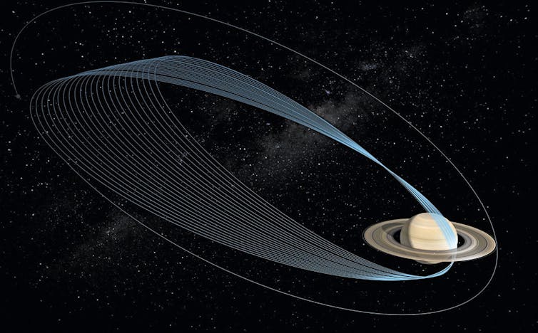 Lo scorso aprile, un incontro ravvicinato con Titan ha preparato Cassini per il suo Gran Finale. Ha modificato l’orbita di Cassini, cambiando le cose in modo che invece di volare al di fuori degli anelli di Saturno ha iniziato a immergersi attraverso lo spazio tra gli anelli e il pianeta.,